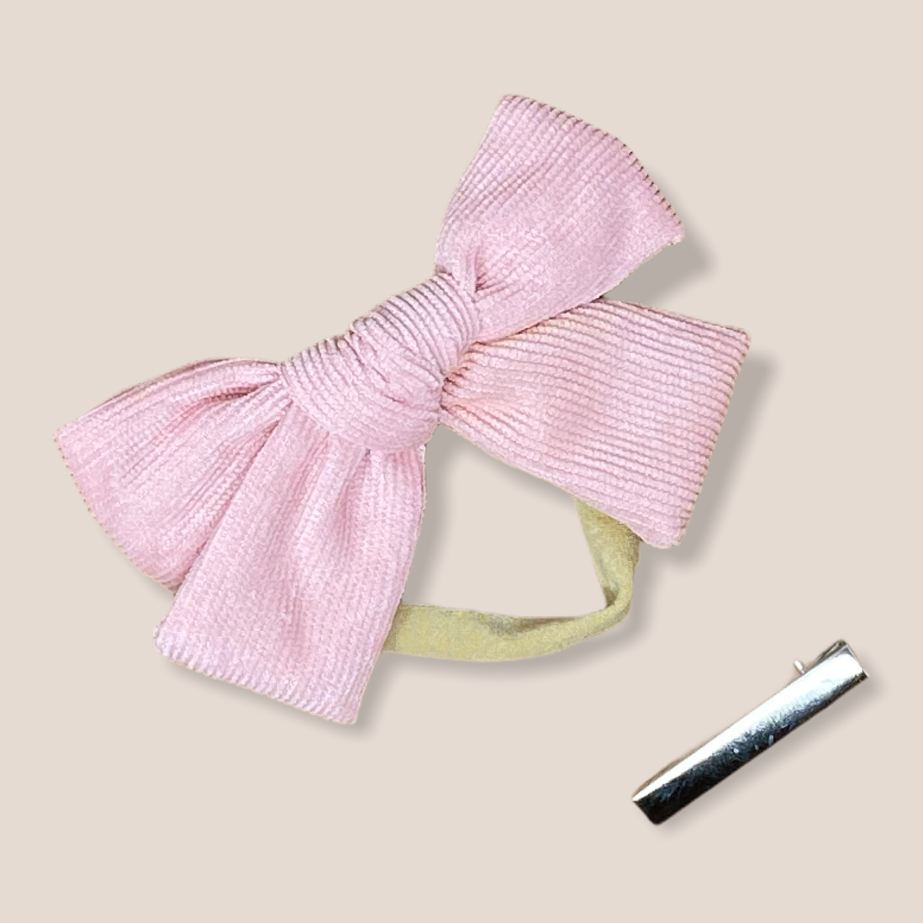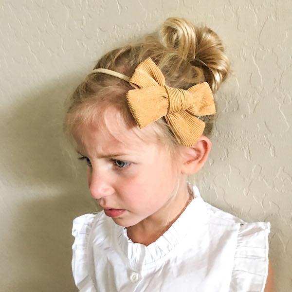 Beautiful large corduroy bow for little girls, which can be mounted on a hairband or alligator clip, it comes with both! Start with the headband, and change it to a clip when your little one is older for example, just cut the headband and insert the clip instead in the knot.