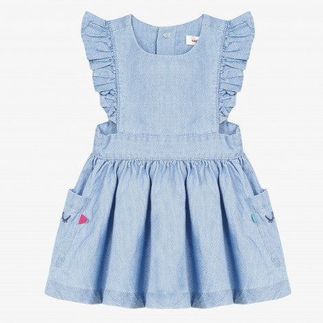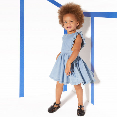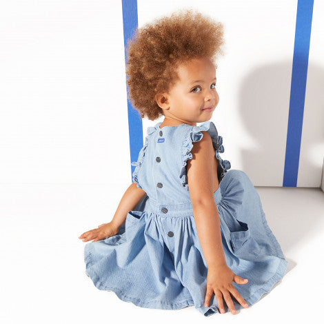 - This summer dress for little girls is sweetly revisited in light fancy denim with ruffles. Baby's sleeveless dress. Light fancy denim. Applied ruffle on the armholes. Large pockets with fun cute little face embroidered on the side. The applied waistband on a full gathered skirt. Opens right down the back with polka dot print snap buttons.
