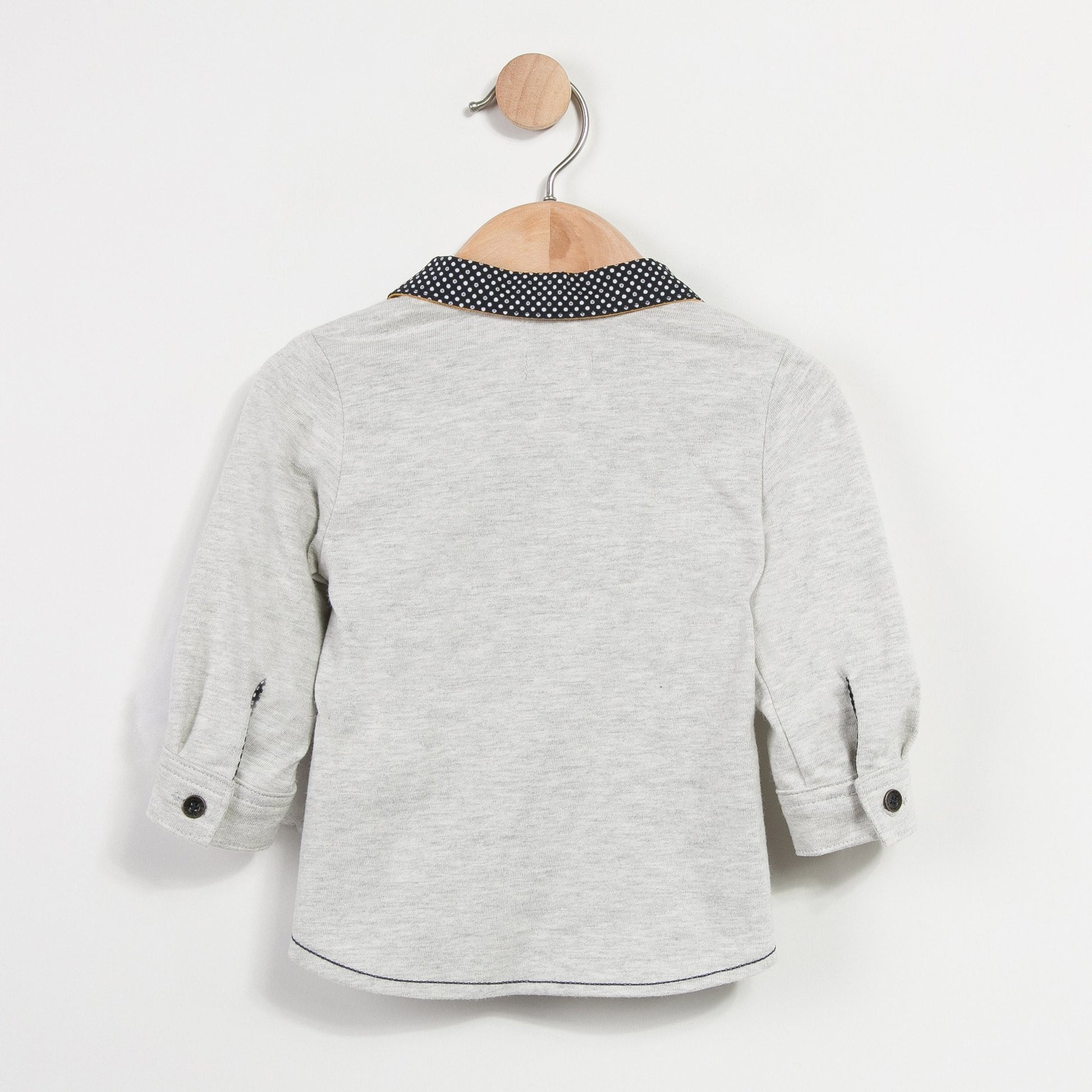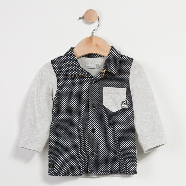 Long sleeve marl jersey shirt with poplin printed polka dots, fun and soft for any baby Boy. A mix of fabrics and graphics that keeps pace with the Boy's looks! Collar lined with bright yellow jersey. Back and sleeves in jersey. Buttoned wrists. Chest pocket with patch. Fastens with 1 press stud and buttons. Rounded hem.