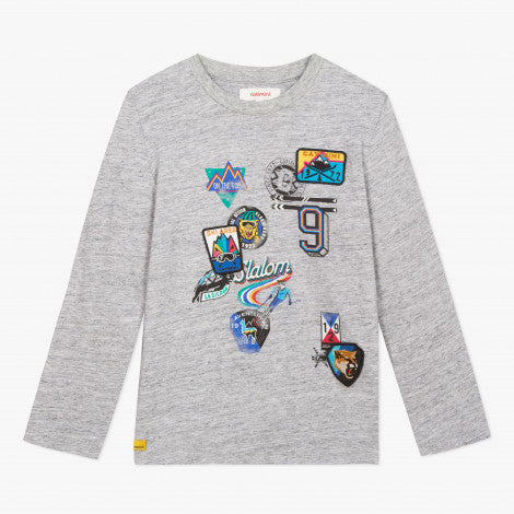 A modern superposition effect with bright colours that takes a new-look at the boys original T-shirt. Long-sleeved T-shirt in a mottled flecked grey jersey. Printed motif under badges on the front. Round neck. Straight cut. Catimini label at the hemline.
