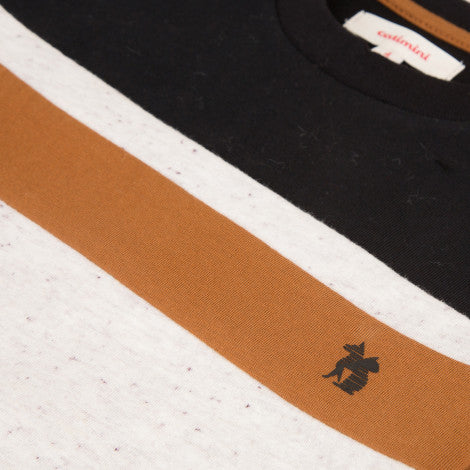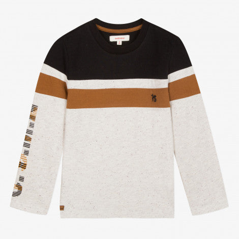 On a soft and trendy distressed mottled fabric, the sporty tape details take this kid's T-shirt in another direction. Long-sleeved T-shirt in pure cotton Jersey with colour block tape details. Printed motif in a striped effect on the sleeve. "Cats and dogs" catimini logo on the chest Chain stitch topstitched finish on the back neckline. Round neck.