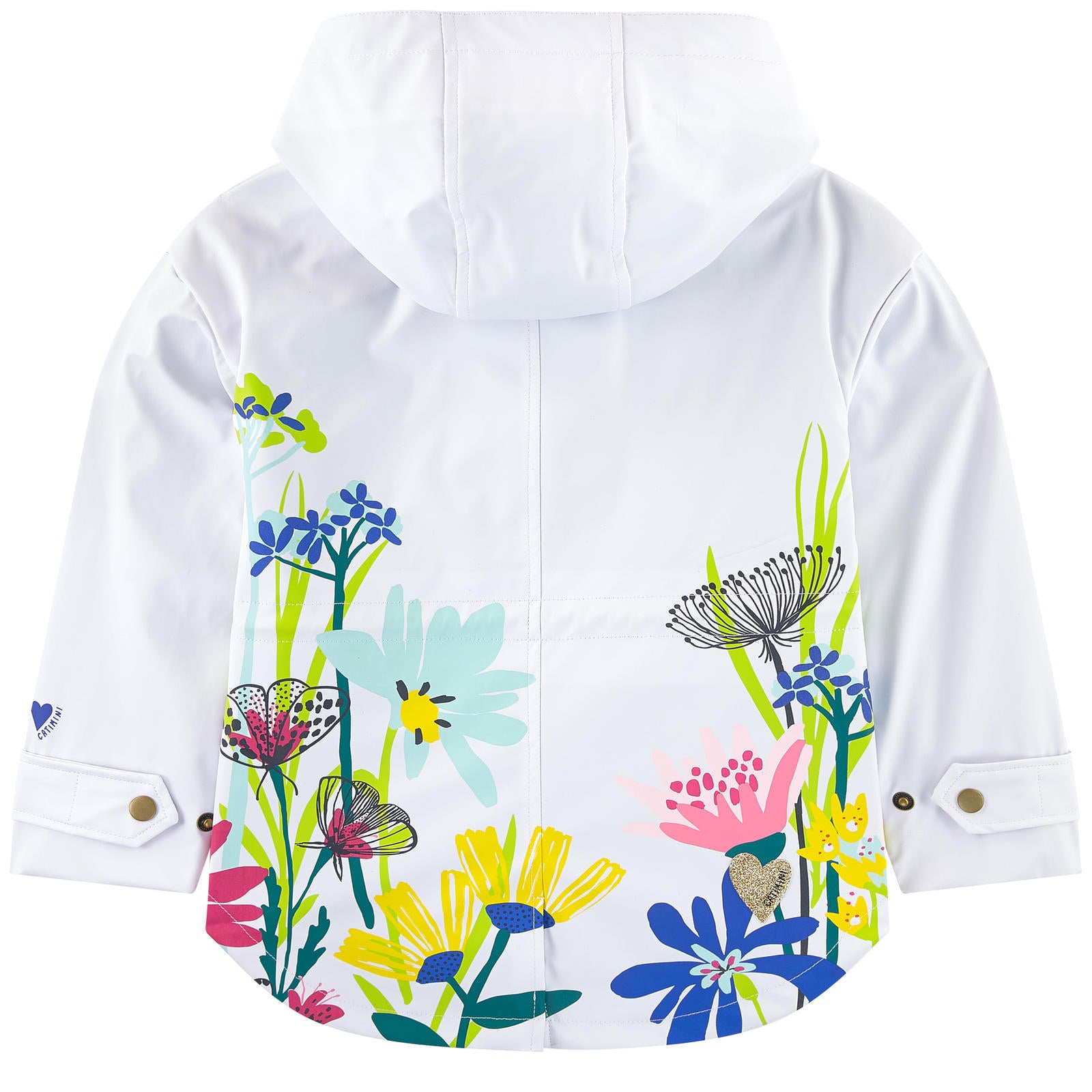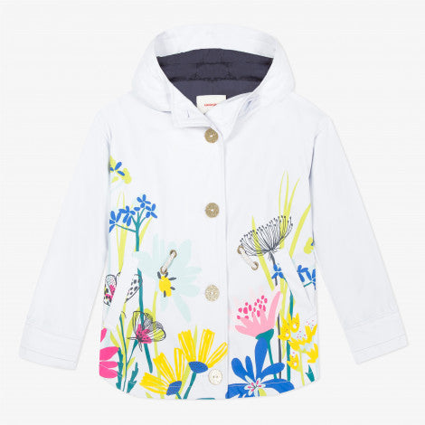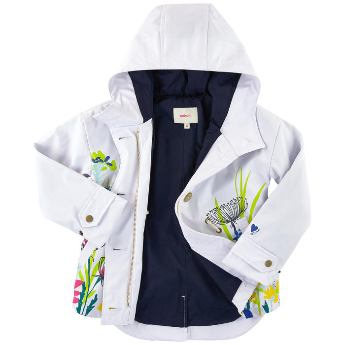 The iconic Catimini raincoat, made of soft rubber lined with percale, perfect for girls for the mid-season! A lightweight coat with a contemporary romantic look. Printed with a stylised floral plant panel. Parka shape with the inner cord with stoppers at the waist. Hood on a high collar. Fastened with sequinned buttons. Buttoned tab at the cuffs. 2 piped pockets. Back slit. A label with Catimini.