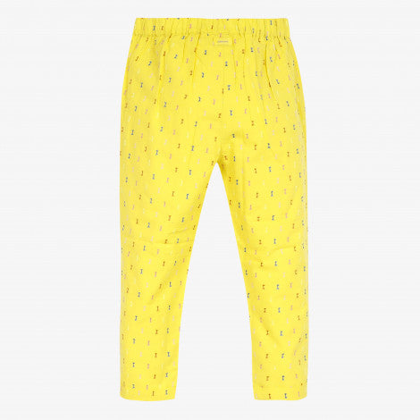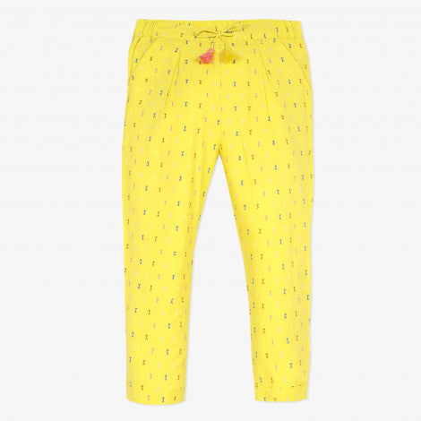 A soft and comfortable colorful dotted Swiss yellow lightweight cotton pants. Elastic waistband with a faux bow and colorful pompoms. Two pockets. Stitched cuffs at the bottom of the leg opening.