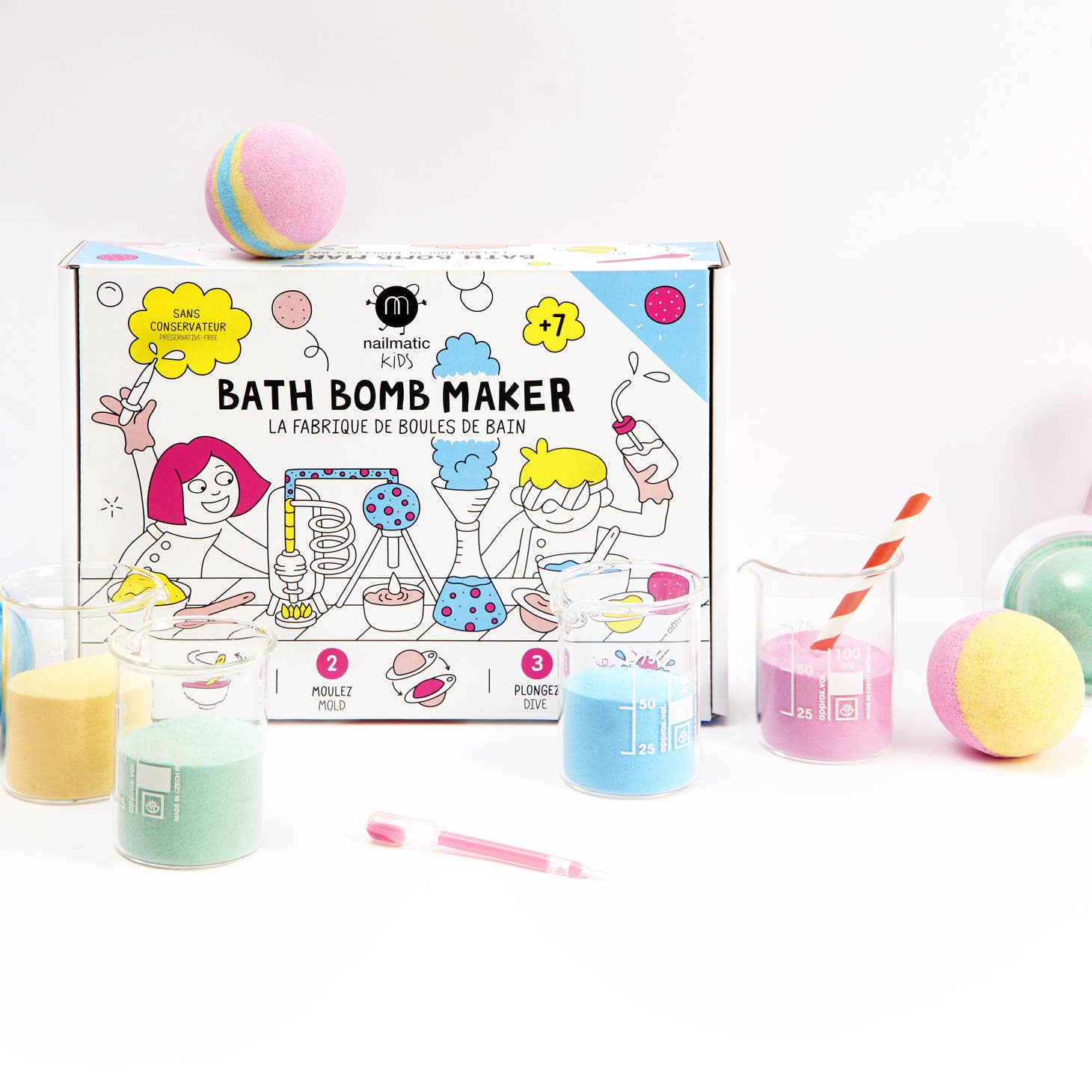 With Bath Bomb Maker, you can create 4 bath bombs for kids. They bring colors to their daily routine but also: - hydration thanks to vitamin E and sweet almond oil - relaxation thanks to chamomile flowers extracts * coloring the water only, no traces on skin or tub.