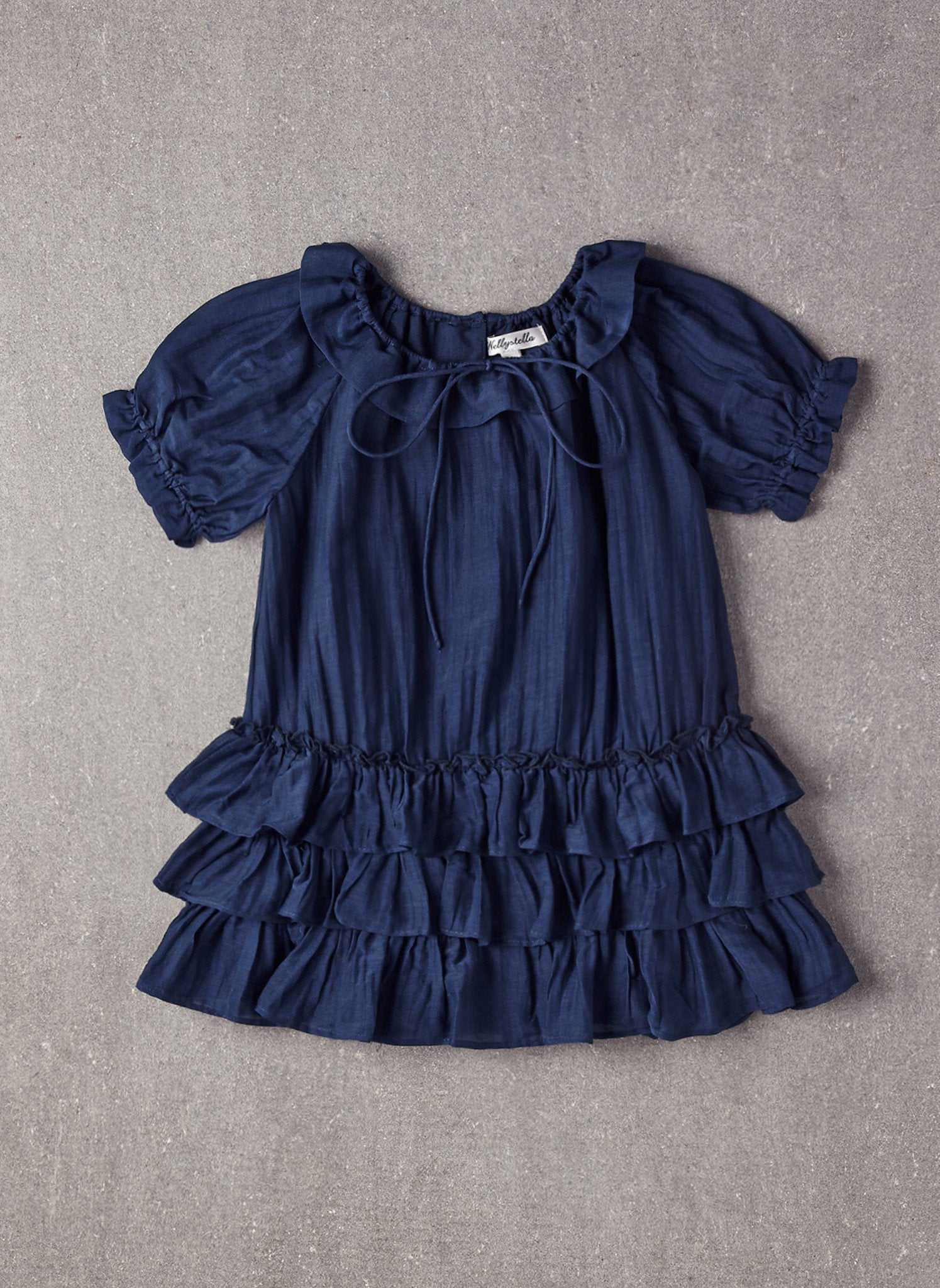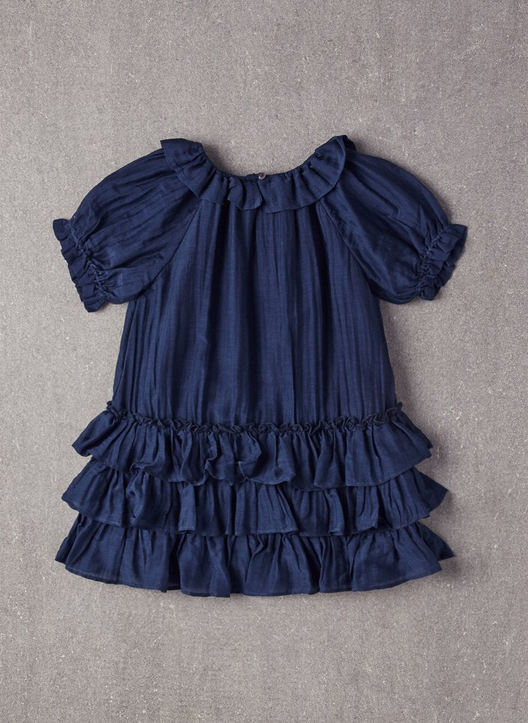 70% cotton & 30% silk drop waist dress with ruffle tiers in Insignia Blue .