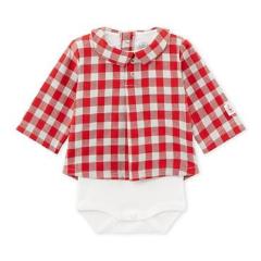 You'll love this baby boy's blouse bodysuit with a blouse part crafted in checkered brushed twill and a body suit in plain brushed 1x1 rib. The baby's garment has attractive, careful detailing that includes a pleat in front, decorative snap buttons at the neckline and a charming rounded hem. There are handy snap buttons at the crotch and on the back. A two-in-one blouse bodysuit that's easy to wear and elegant.